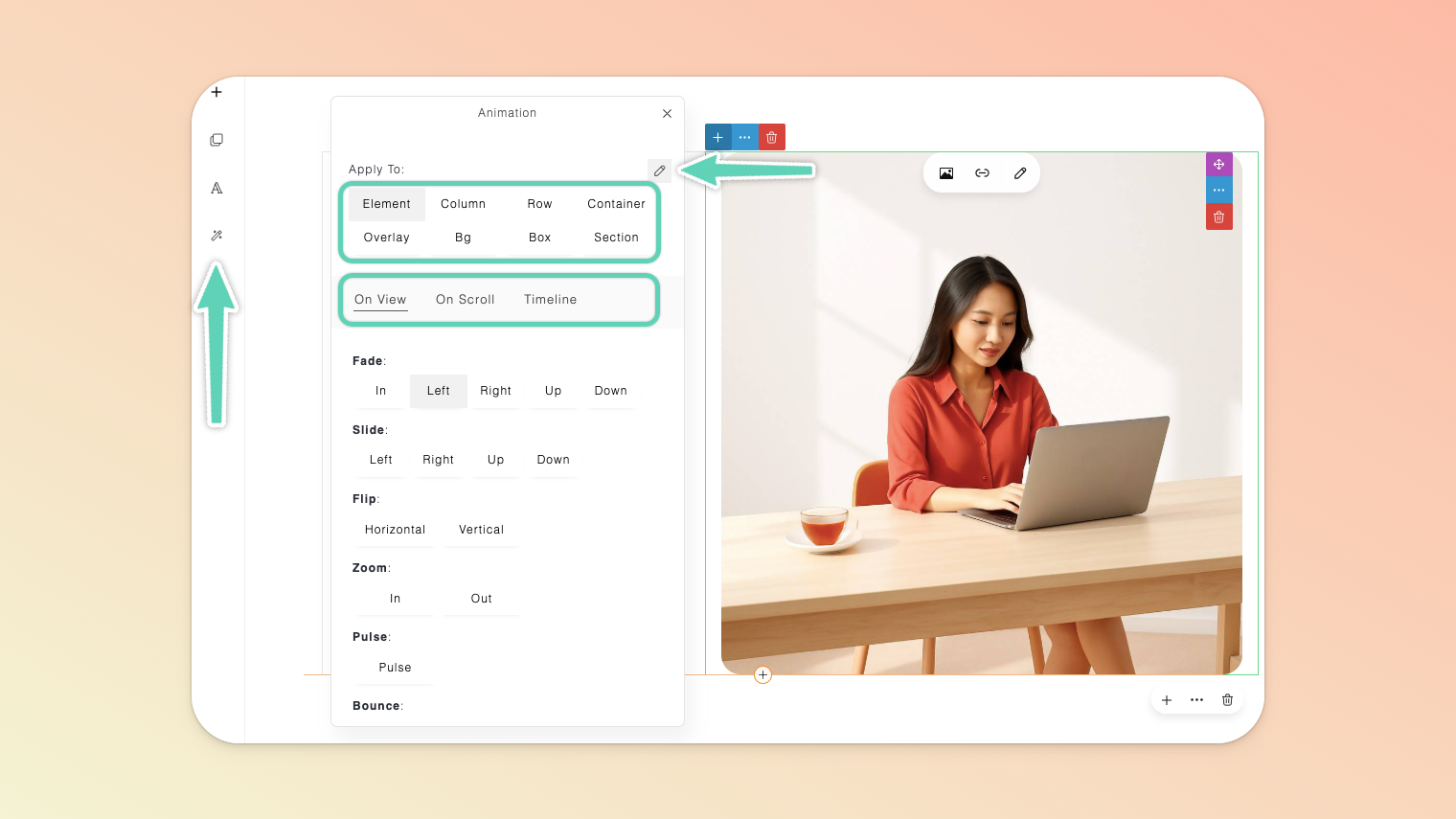 ️ AnimationsClick into the area of the section you want to animate and then click the magic wand/animation icon in the Page Builder’s left main menu.