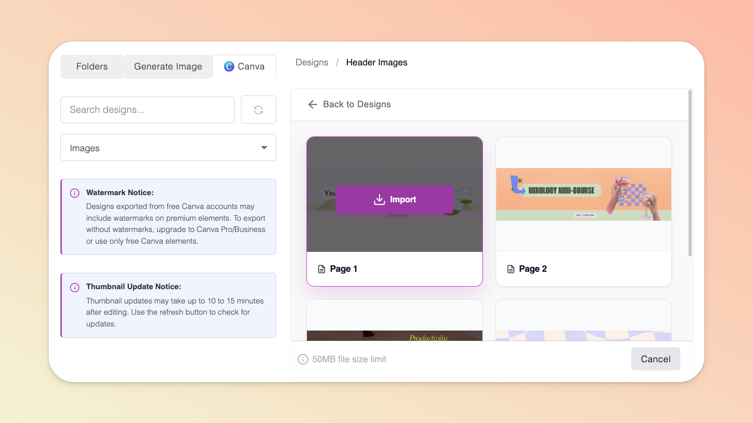 To save and use a Canva design in your file manager, hover over the relevant Canva file and click the Choose page to import button.