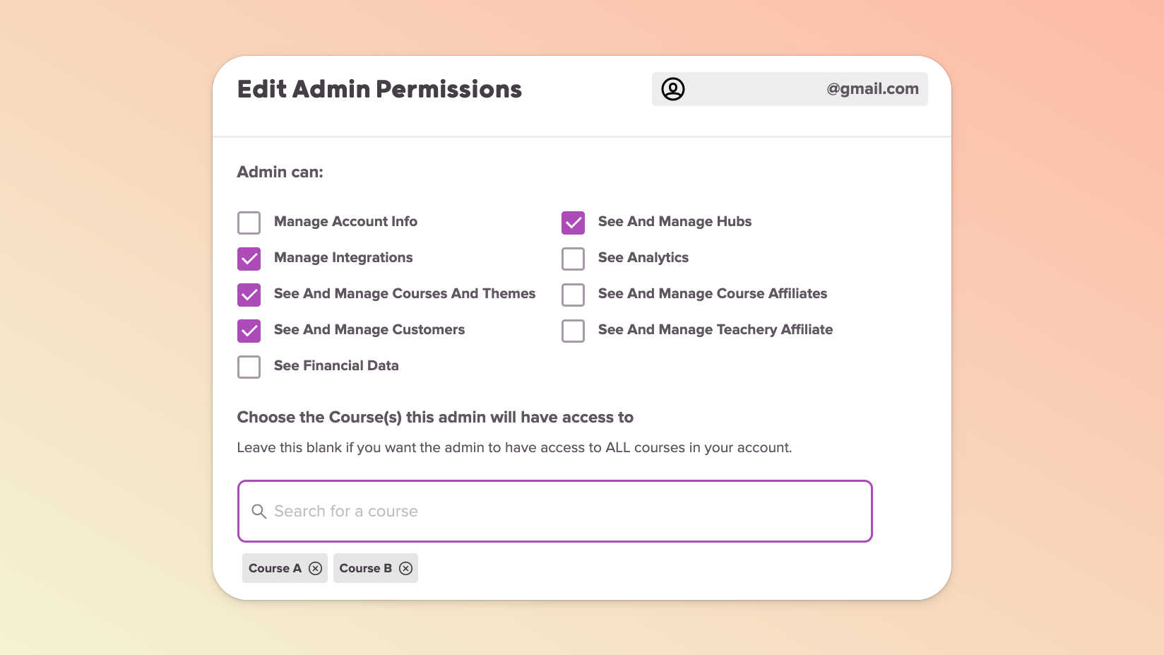 In the popup that appears, set the admin’s permissions and define which course(s) to grant access too (leave that field blank for access to all courses).
